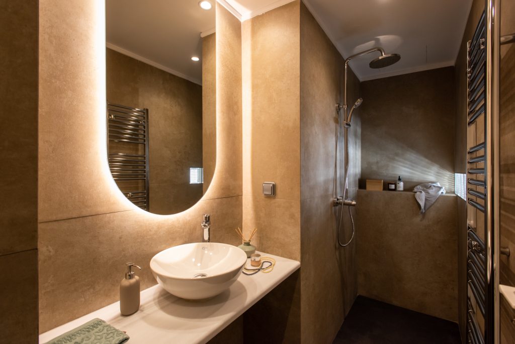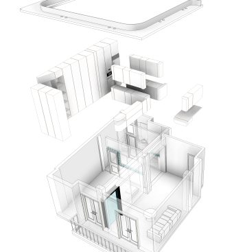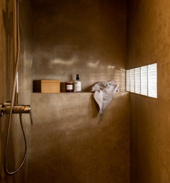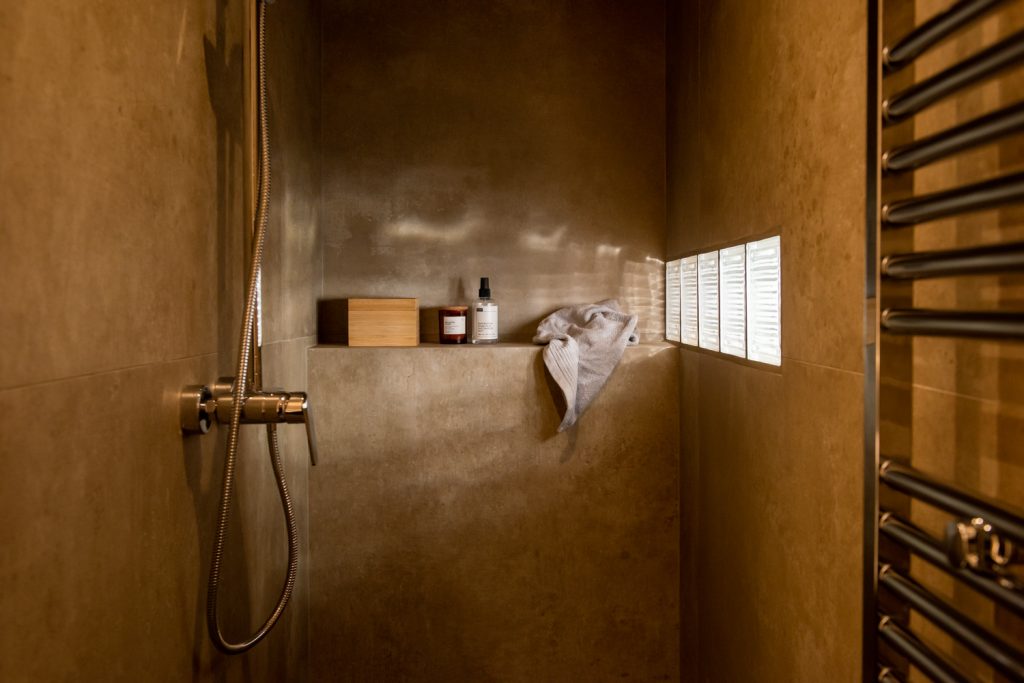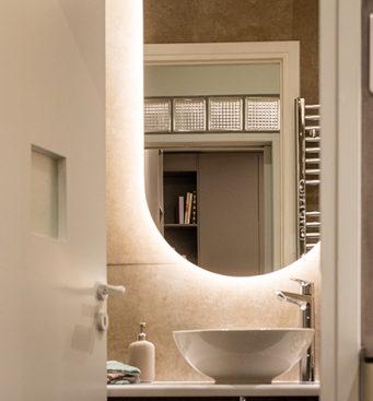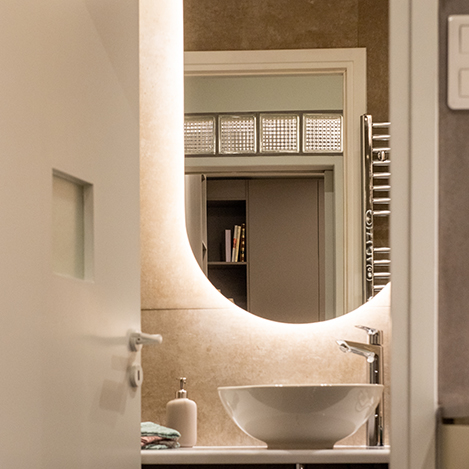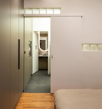 Material Reuse – The stained glass of the old sliding door is reused in the new bathroom in order to brighten it up. A squared shape opening, in the size of a glass brick, is placed on the door.