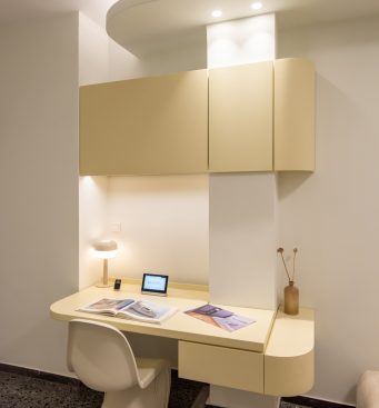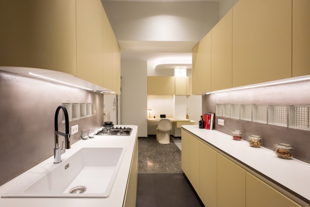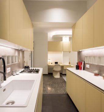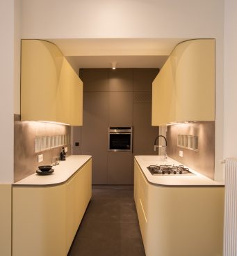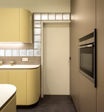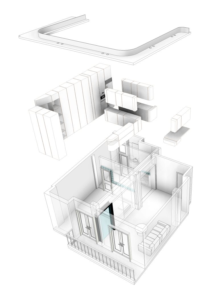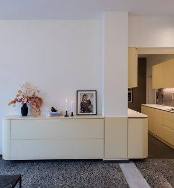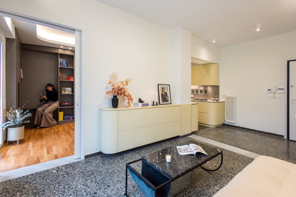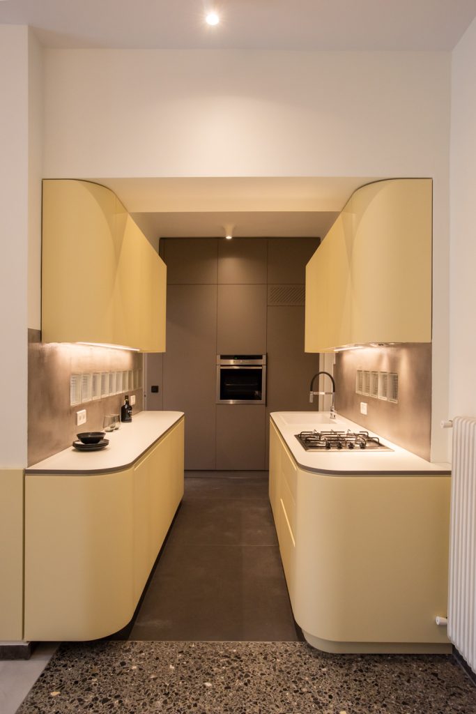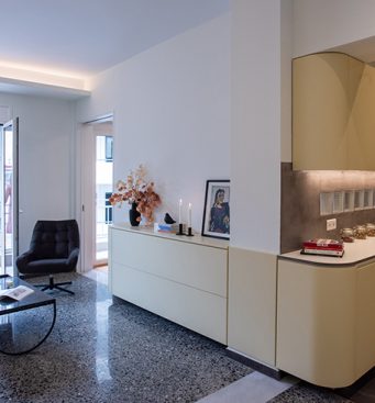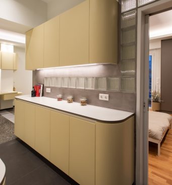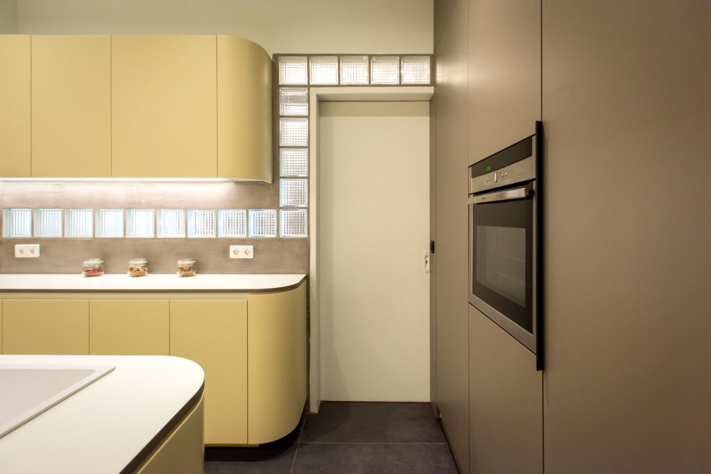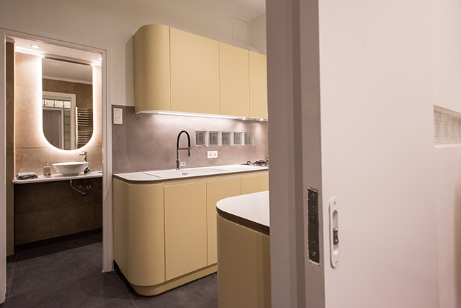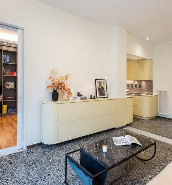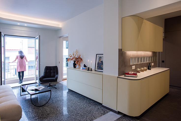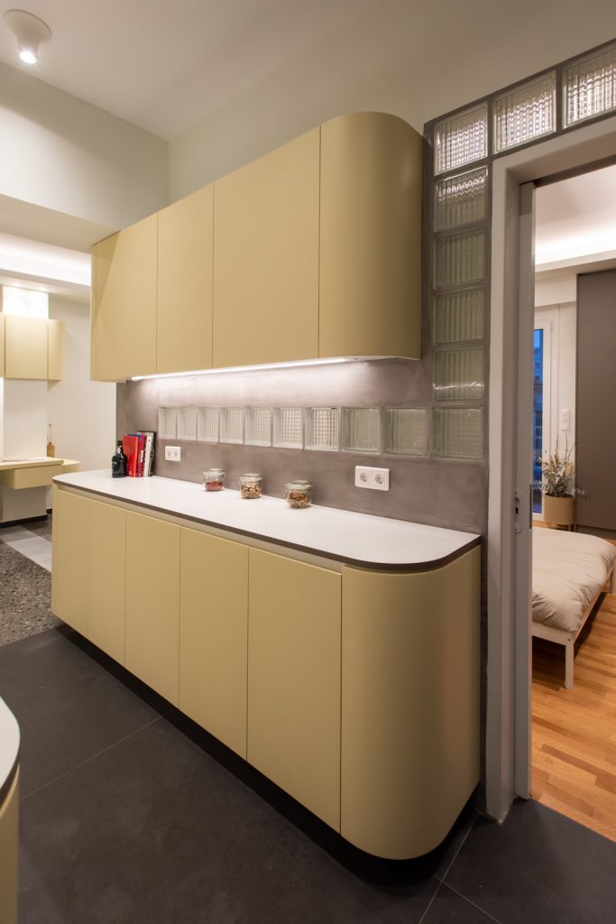 The kitchen area is integrated with the living room and the bedroom, as its furniture continue uniformly to both areas. The lacquered wood curves around the corners and turns from a kitchen cabinet into a living room furniture, indicating the continuity of the space and the flow of movements. The old terazzo floor of the living room is preserved and the new floor in the kitchen continues in the same colouring. The tall kitchen cabinets extend into the bedroom and turn into a wardrobe and a bookcase, thus signifying the transition through spaces.