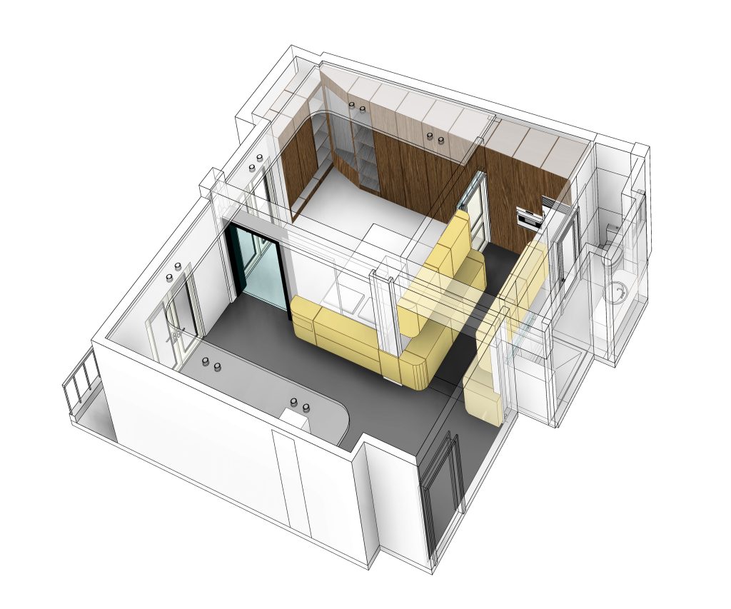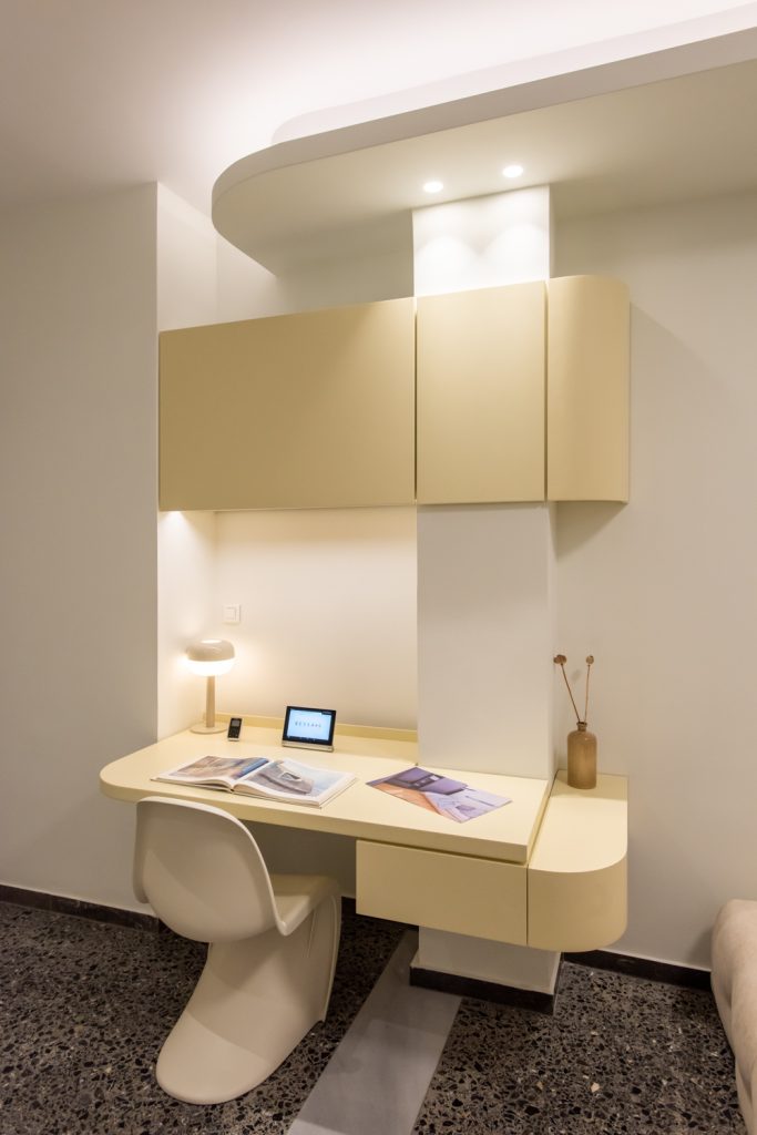 The design implements the idea of a continuous movement that runs through the spaces, and tracks human activity of daily living, in the center of which the sleeping area is placed; the bed. The flow of movement inside the apartment is implied by the continuity of the furniture between spaces, the colouring and the lighting on the ceiling.