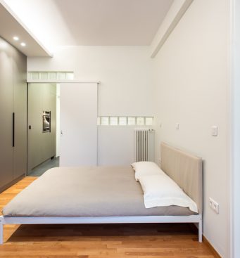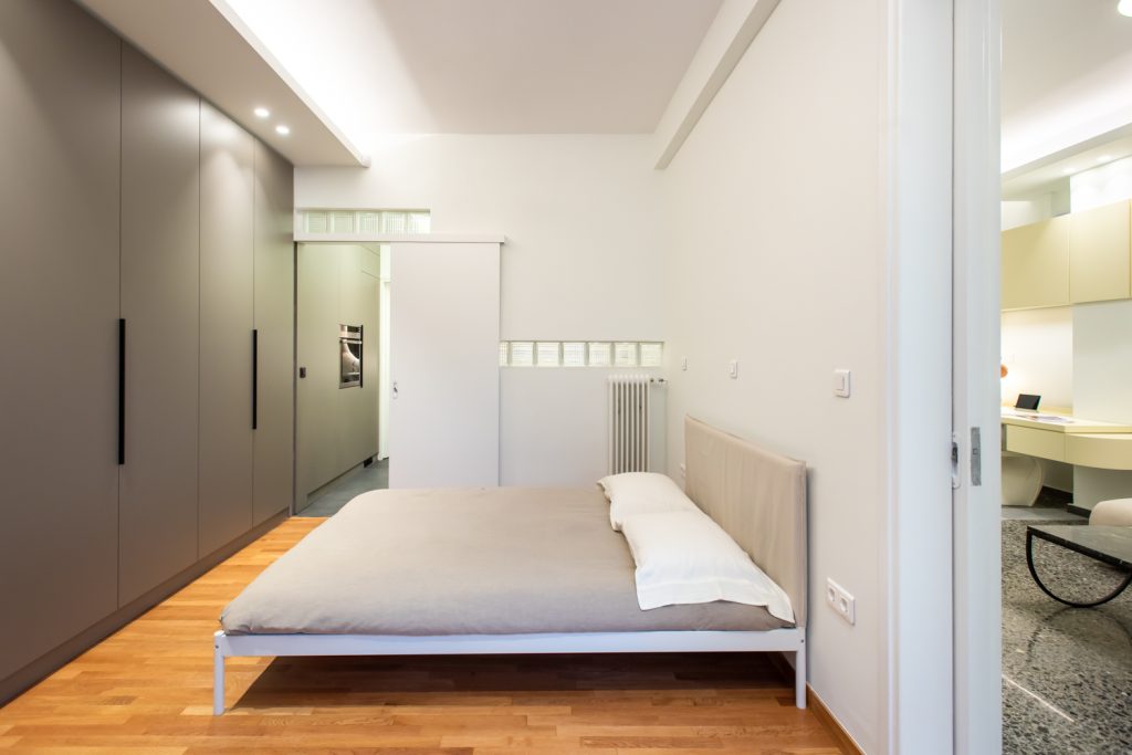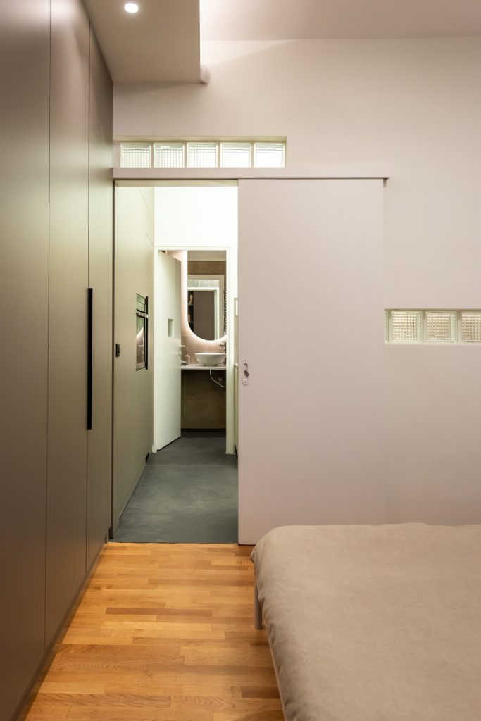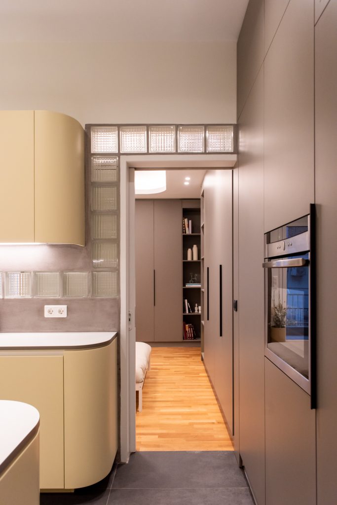 The isolated and “hidden” kitchen of the old apartment is moved “in front”, redesigned and opened to the living area and the guests of the house. Instead of being a separate room, it maximizes its space, maintaining a dual function: food preparation area and passage-corridor. The sliding doors of the bedroom allow double access, both from the kitchen and the living room, and flow of movement.