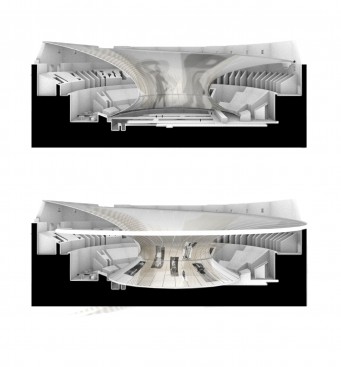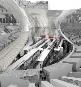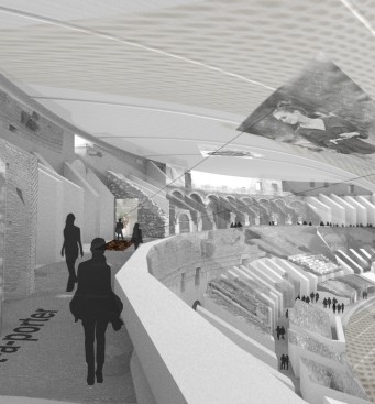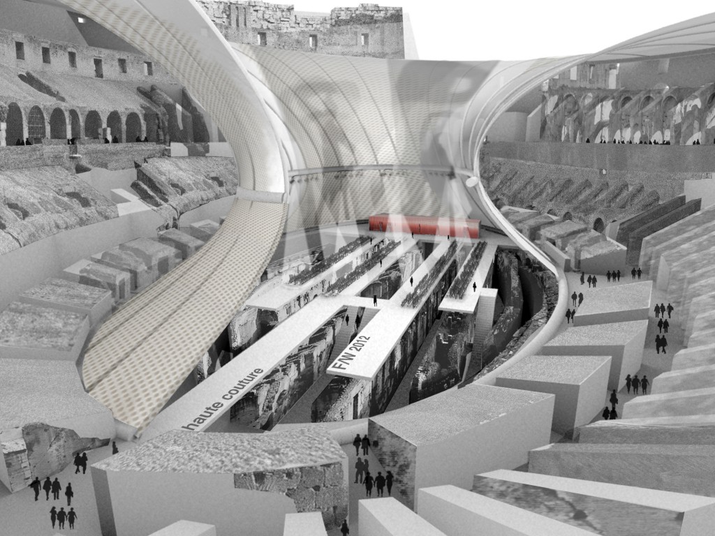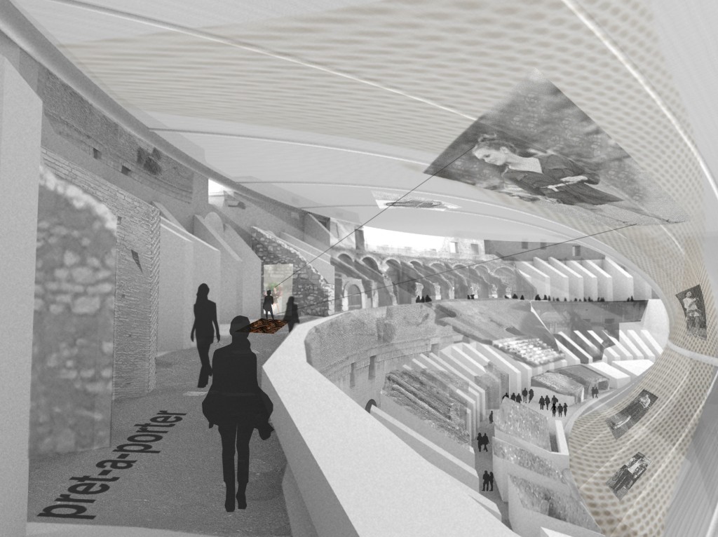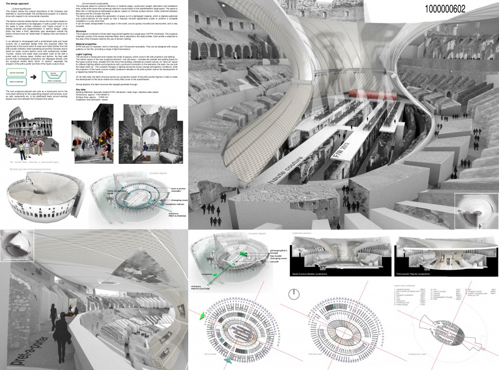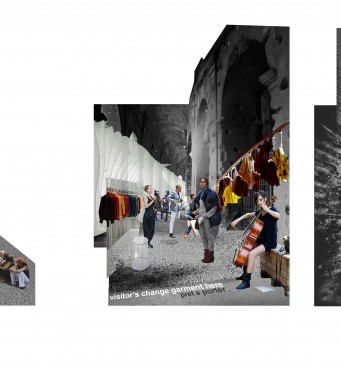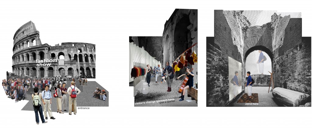 In an attempt to choreograph prêt a porter/street style and haute couture into a seamless design brief, this proposal offers the opportunity to the tourist visitor to wear and model clothes from the prêt a porter collection while wandering around the Colosseo and to watch an haute couture fashion show with professional models. Tourists, visitors and street style journalists meet at the prêt a porter walk to discuss ideas, clothes and fashion. As they walk around their photographic projections are displayed directly onto the sculptural tensile fabric which “in section” separates the program of the prêt a porter and that of the haute couture show.